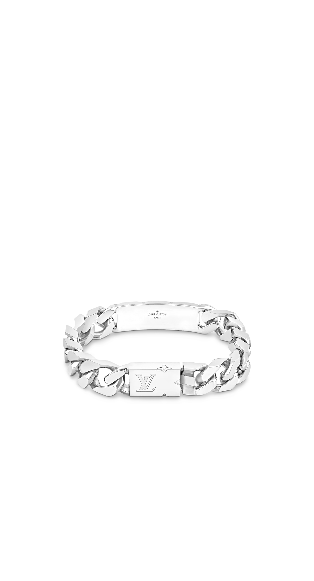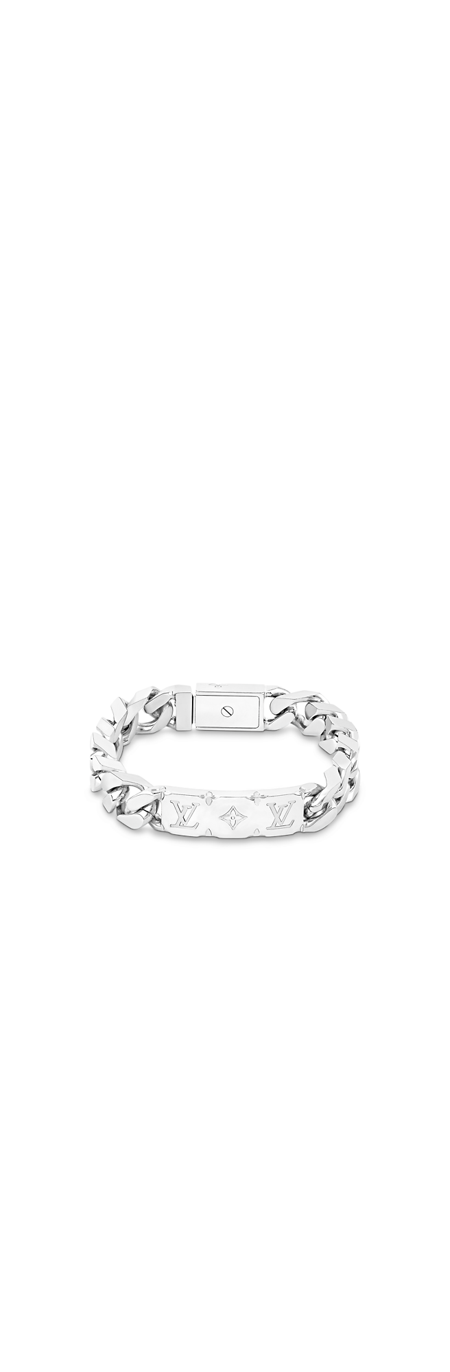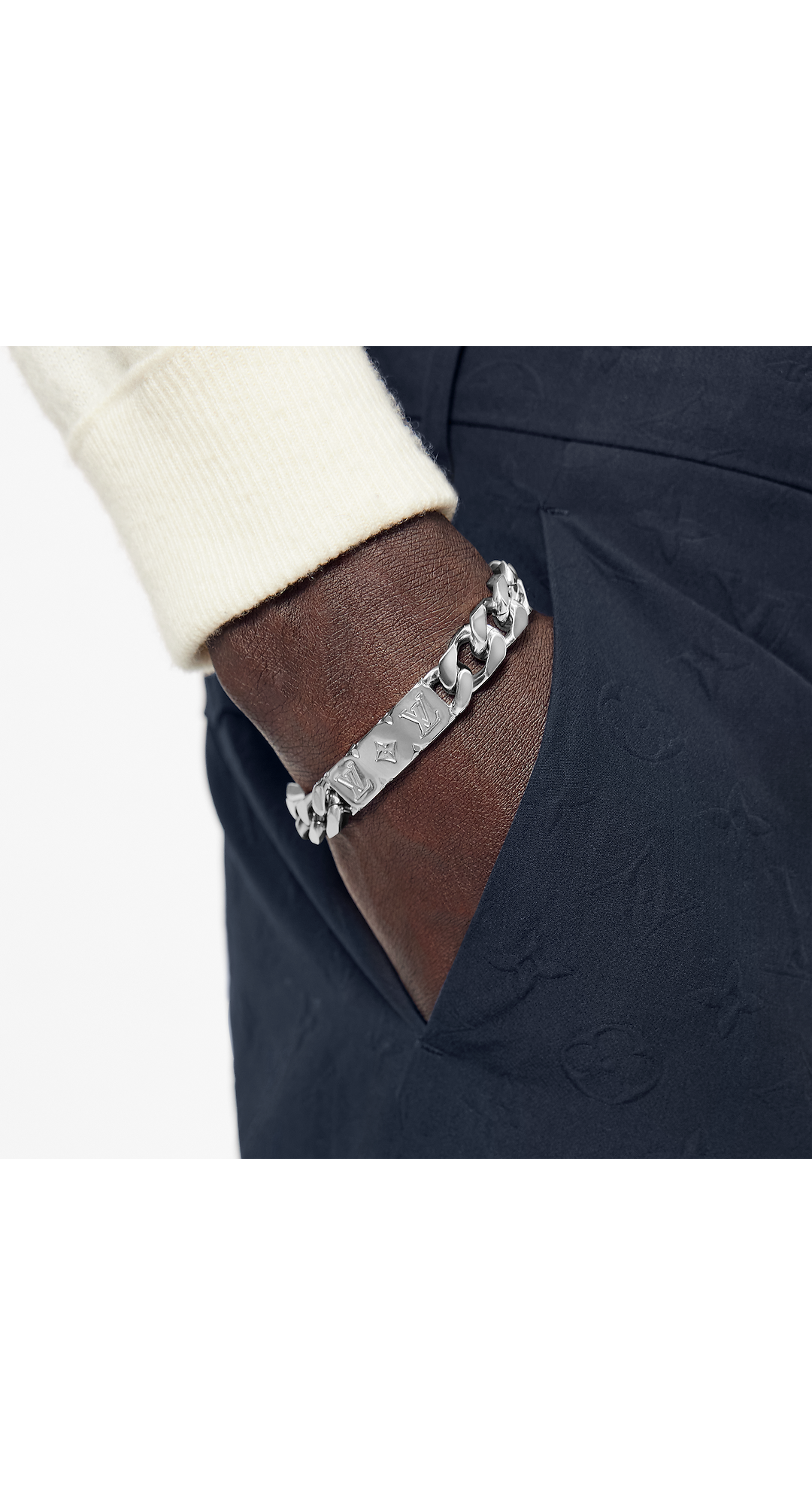 細かく彫刻されたモノグラム・パターンに光沢感のあるシルバーカラーの仕上げを施した「チェーンブレスレット モノグラム」。力強いデザインでマスキュリンな装いを演出するチェーンブレスレットは、紳士の日常のワードローブに欠かせないアイテムです。